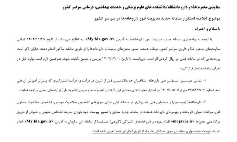 بر اساس این ابلاغ، تمامی فرآیندهای مرتبط با داروخانه‌ها از جمله صدور مجوزها، تغییرات، تمدیدها و امور اداری، از طریق سامانه My.fda.gov.ir انجام خواهد شد.