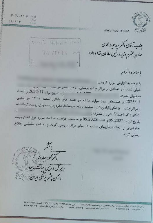 شانزدهم اردیبهشت‌ماه امسال، نامه از سوی رئیس انجمن چشم‌پزشکی ایران خطاب به معاون وزیر بهداشت به دفتر رئیس سازمان غذا و دارو ارسال شد که حاوی خبر و اطلاعات مهمی بود. در متن نامه چنین آمده است: «جناب آقای دکتر سید حیدر محمدی، معاون وزیر بهداشت و درمان و رئیس سازمان غذا و دارو، باتوجه‌به گزارش تعدادی از مراکز چشم‌پزشکی سراسر کشور در هفته‌های آغازین سال جدید، به دنبال مصرف دارویی که تولید آن مربوط به سال 2022 و انقضای آن 2025 است؛ ولی منجر به کم‌سو شدن و ازبین‌رفتن قرنیه چشم بیماران شده است و همین‌طور بروز موارد مشابه در هفته‌های پایانی اسفند ۱۴۰۱ در بعضی از مراکز چشم‌پزشکی آبادان، شیراز، مشهد، تربت‌حیدریه، گناباد، فردوس، ارومیه، اصفهان، کرمانشاه و کنگاور؛ خواستاریم برای جلوگیری از ایجاد مشکل مشابه در سایر مراکز دستورات لازم و بررسی‌ها انجام گیرد.»