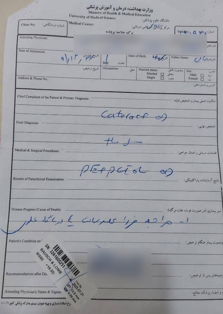تأکید می‌شود، این نامه‌ای است که دکتر محمود جباروند دبیرکل و رئیس هیئت‌مدیره انجمن چشم‌پزشکی ایران در تاریخ ۱۶ اردیبهشت ۱۴۰۲ برای رئیس سازمان غذا و دارو ارسال کرد. تحقیقات از آن زمان آغاز شده، اما بیماران طبق گفته خودشان بدون هیچ حمایتی از هیچ سویی با چشمانی که از تقریباً از دست رفته‌اند از شهری به شهر دیگر برای درمان آواره هستند.