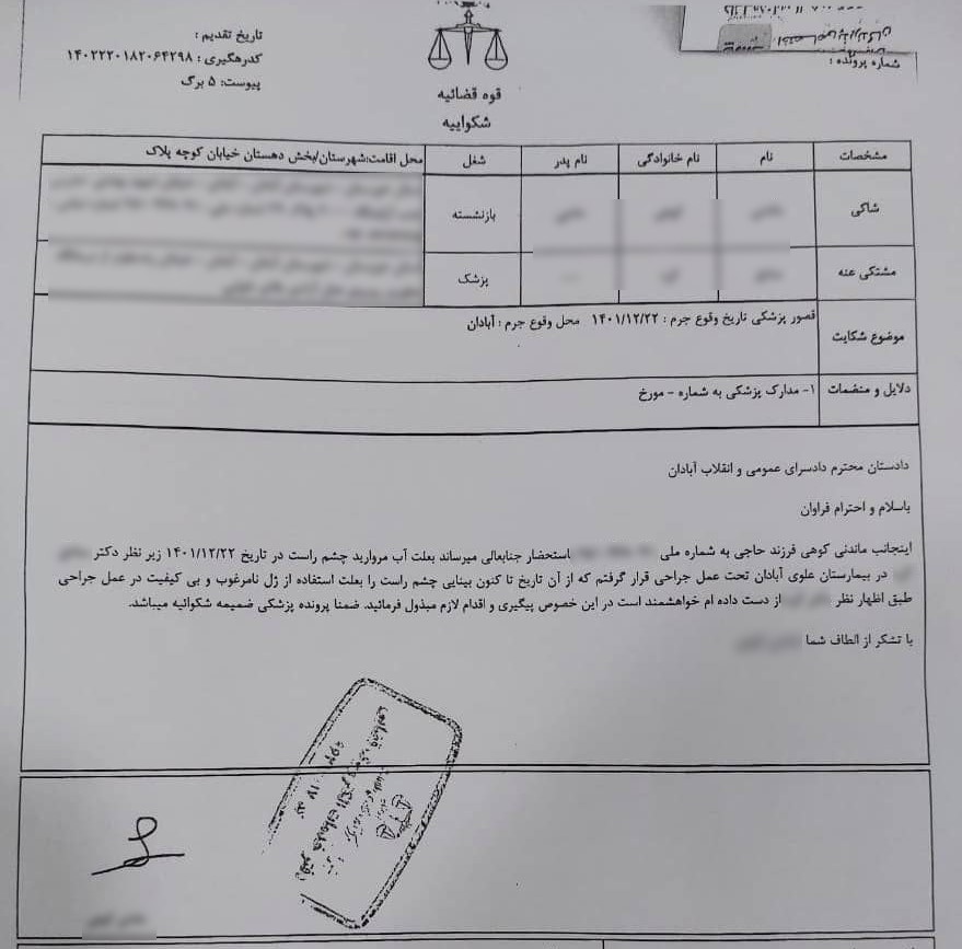 وی با اشاره به اینکه بعد از عمل جراحی، نه‌تنها مشکل تاری چشمش حل نشد، بلکه این روزها حتی نیم‌متری خودش را هم به‌خوبی نمی‌بیند، می‌گوید: «من چشم راستم را عمل کردم و خدا را شکر می‌کنم که چشم چپم همچنان بینایی خوبی دارد. وقتی پیش یک دکتر دیگر رفتم، به من گفت که چشم راستم به‌خاطر عمل بینایی‌اش را از دست داده است.»