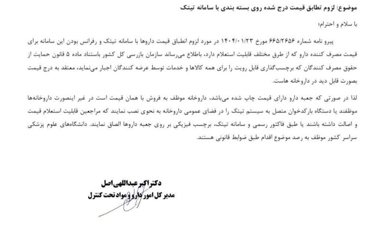 اکبر عبداللهیاصل مدیرکل دارو، در نامهای به معاونین غذا و داروی دانشگاههای علوم پزشکی کشور، خواستار نظارت بر فروش دارو در سطح داروخانه ها بر اساس قیمت درج شده بر روی جعبه یا بسته بندی دارو و یا ارجاع به سامانه تیتک شد.