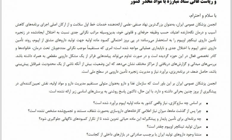 انجمن پزشکان عمومی ایران در نامه‌ای رسمی خطاب به دکتر مسعود پزشکیان، رئیس‌جمهور و رئیس عالی ستاد مبارزه با مواد مخدر، نسبت به اختلال جدی در زنجیره تأمین داروی حیاتی تینکچر اوپیوم هشدار داد.