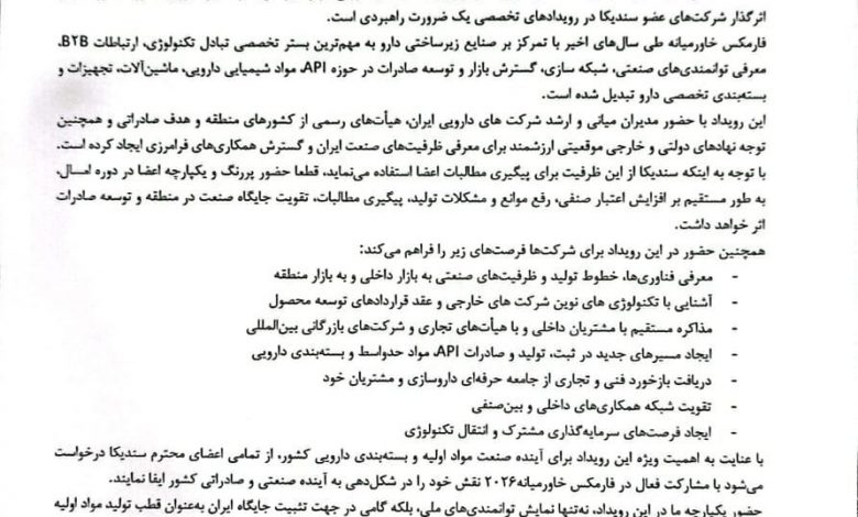 به همین دلیل است که سندیکا در این نامه، فارمکس را بستر طبیعی و منطقی حضور شرکتها معرفی کرده است؛ جایگاهی که عدم حضور در آن عملاً به معنای دور ماندن از جریان تحولات صنعتی خواهد بود—نه به دلیل الزام، بلکه به دلیل سرعت رشد صنعت و جهتگیری آن.