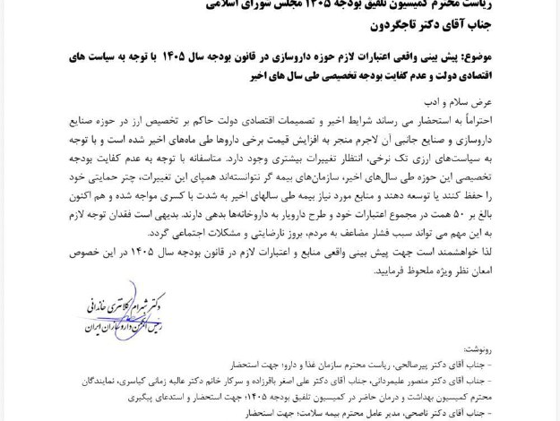 دکتر شهرام کلانتری خاندانی رئیس انجمن داروسازان ایران، در نامه‌ای به رئیس کمیسیون تلفیق لایحه بودجه ۱۴۰۵، خواستار توجه به اعتبارات حوزه دارو شد و گفت: بدهی بیمه‌ها در مجموع اعتبارات خود و طرح دارویار به داروخانه‌ها به ۵۰ همت رسیده است.