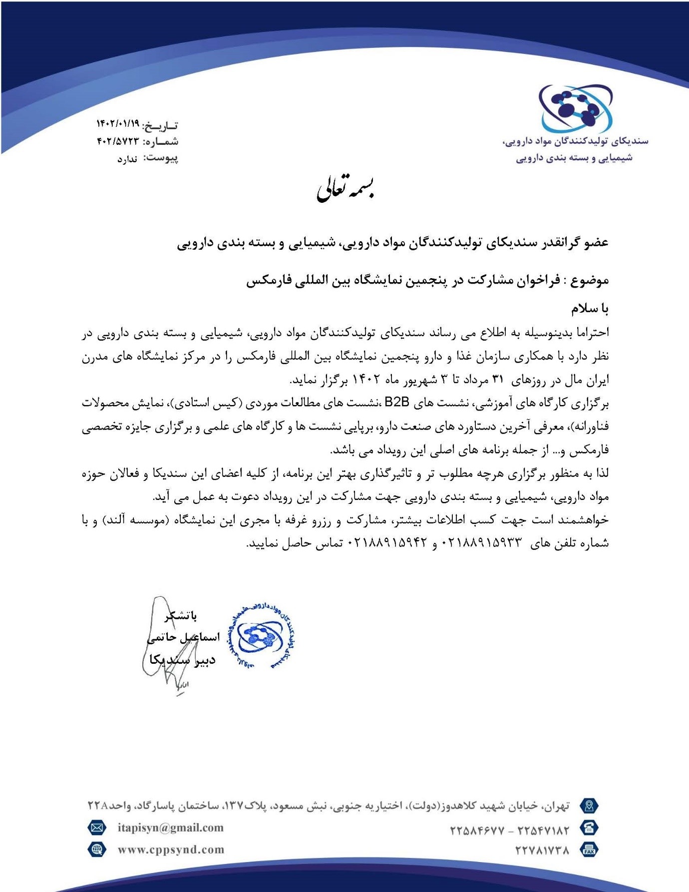 احتراما بدینوسیله به اطلاع میرساند سندیکای تولیدکنندگان مواد دارویی، شیمیایی و بستهبندی دارویی در نظر دارد با همکاری سازمان غذا و دارو پنجمین نمایشگاه بینالمللی فارمکس را در مرکز نمایشگاههای مدرن ایران مال در روزهای ۳۱ مرداد تا ۳ شهریور ماه ۱۴۰۲ برگزار نماید.