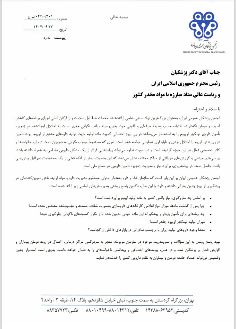 انجمن پزشکان عمومی ایران در نامهای رسمی خطاب به دکتر مسعود پزشکیان، رئیسجمهور و رئیس عالی ستاد مبارزه با مواد…